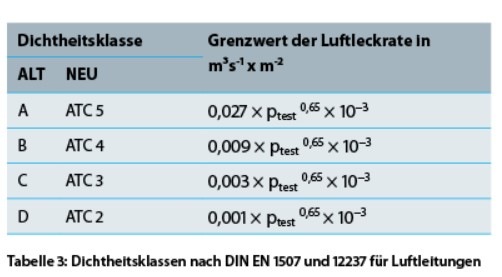 Der Prüfdruck wird in DIN EN 1507 mit ptest bezeichnet, in DIN EN 12237 mit pt. Die Klasse D bzw. ATC 2 bleibt Luftleitungen für besondere Anwendungen vorbehalten, wodurch Klasse C (ATC 3) den Standard für die normale Anwendung darstellen sollte. Im Gegensatz zu den zentralen RLT-Geräten, die bereits fertig zusammengebaut ab Werk geliefert werden, muss beim Kanalsystem besonders auf die richtige Verarbeitung vor Ort geachtet werden. Auch bei den Luftleitungen gilt: je mehr Oberfläche, desto mehr Leckage. Darum sollte auch in diesem Fall unnötige Fläche und damit unnötig lange Kanalstrecken vermieden werden. Hier ist eine gute Planung der Luftstrecken in Koordination mit allen anderen Gewerken ein wichtiger Faktor.