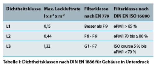 Die Leckluftrate wird hier bei einem Unterdruck von 400 Pa ermittelt. Die Einteilung der Gehäuse erfolgt in Dichtheitsklassen: