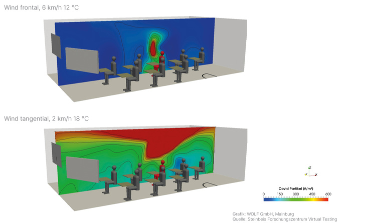 Bereits in der Übergangszeit kann der Luftaustausch über die Fenster deutlich eingeschränkt sein. Während beispielsweise die Aerosolkonzentration nach 5 min Fensterlüftung bei einem frontal anströmenden Wind von 6 km/h auf die weit geöffneten Fenster um rund 90 Prozent deutlich abnimmt, reduziert sich diese nach 5 min Fensterlüftung bei einem seitlich vorbeiziehenden Wind von nur 2 km/h nur noch um 45 Prozent. Zusätzlich beeinflusst die Differenz zwischen Außen- und Raumtemperatur die Lüftungseffizienz. In der Simulation wurde eine Raumtemperatur von 22 °C und bei schwachem Wind eine Außentemperatur von 18 °C bzw. bei starkem Wind von 12 °C angenommen.