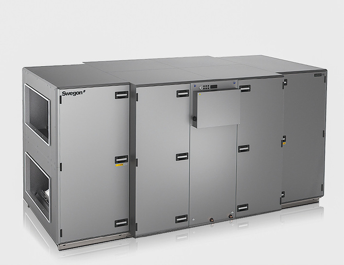 Swegon hat die Lüftungsgeräte-Serie Gold PX mit Plattenwärmeübertrager um drei Baugrößen für größere Luftvolumenströme ergänzt. Die Größen 040 +, 050 + und 060 + decken Luftvolumenströme zwischen 16.000 und 18.000 m³/h ab und sind in den Varianten MTE für hohe Temperatureffizienz und MPE für geringen Druckverlust erhältlich. Die Geräte verfügen über einen Gegenstrom-Plattenwärmetauscher vom Typ Recoflow, Zu- und Abluftventilatoren, Filter sowie eine integrierte Regelung. Durch getrennte Luftströme wird eine Geruchsübertragung zwischen Ab- und Zuluft verhindert. Zur variablen Regelung des Wirkungsgrads bei der Wärmerückgewinnung sind serienmäßig mittig montierte Bypass-Klappen und zwei Wärmetauscher-Klappen verbaut. Eine bedarfsgeregelte Frostschutzfunktion namens Recofrost für den Plattenwärmetauscher ist ebenfalls integriert. Die baugleiche Serie Silver C PX wird ohne integrierte Regelung angeboten. Die Lieferung erfolgt standardmäßig fertig montiert, optional auch teilmontiert, wobei die Plattenwärmetauscher-Sektion auf der Baustelle entfernt werden kann.