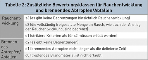 Um die Euroklassen für lineare Produkte (wie beispielsweise Dämmschläuche) von ebenen Produkten (Dämmplatten) zu unterscheiden, werden diese mit einem tiefer gestellten L” (Kurzzeichen L für linear) gekennzeichnet. Im SBI-Test werden auch die Rauchentwicklung und das brennende Abtropfen von Bauprodukten gemessen. Hierfür wurden zusätzliche Klassen entwickelt, die mit s“ (Kurzzeichen s für smoke) und d“ (Kurzzeichen d für droplets) be-zeichnet werden ( Tabelle 2 ).