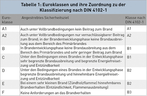 Während technische Dämmstoffe in den nationalen Prüfverfahren für Baustoffe primär nach ihrer Flammwidrigkeit bewertet wurden, sind die Bewertungskriterien des europäischen SBI-Tests wesentlich komplexer und erlauben eine realistischere Beurteilung des Brandverhaltens der verschiedenen Produkte. Die Klassifizierungsnorm DIN EN 13501-1 [2] unterscheidet die Brandklassen A1, A2, B, C, D, E, F. Die Tabelle 1 zeigt die neuen Euroklassen, das angestrebte Sicherheitsziel sowie ihre Zuordnung zur bisherigen Brandklassifizierung nach DIN 4102-1.