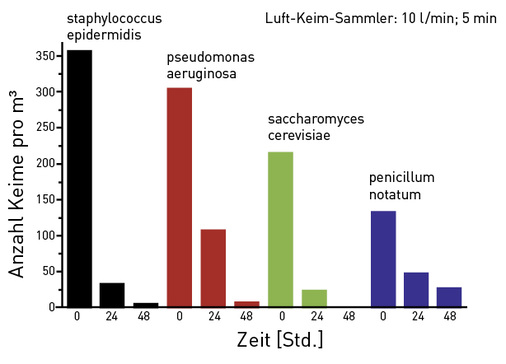 Die vier Balken-Diagramme eines Laborversuchs zeigen, wie die Luftaufbereitung arbeitet: Innerhalb von 48 Stunden sinkt die Anzahl der verschiedenen schädlichen Keime in der Raumluft nahezu auf null. Ein Gutachten der Universität Marburg bestätigt die Inaktivierung der Keime innerhalb weniger Sekunden.