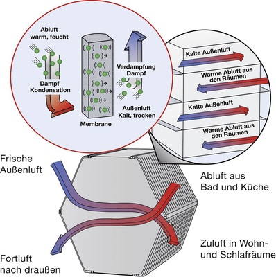 Zehnder: Ein Enthalpieübertrager kann im Gegensatz zu einem „normalen“ Wärmeübertrager nicht nur die Wärme zwischen Abluft- und Zuluftstrom übertragen, sondern zusätzlich auch Feuchte. Er kann somit neben der Wärmeenergie auch einen großen Teil der Feuchtigkeit aus der Abluft zurückgewinnen, ohne dass es dabei zu einer zu hohen Raumluftfeuchte kommt. Ein solches System ist vor allem im Winter sinnvoll, wenn die Luft im Hause sonst besonders trocken wäre, und schafft dann ein behagliches Raumklima. -