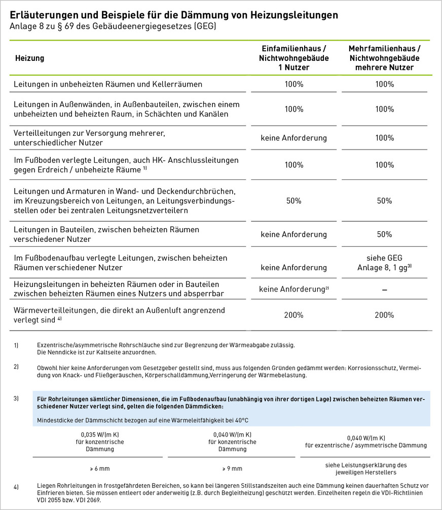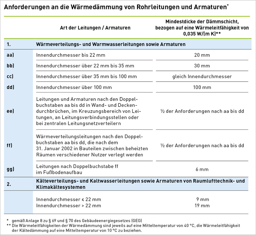 In der Tabelle 1 werden die Anforderungen an die Wärmedämmung von Rohrleitungen und Armaturen (Dämmschichtdicken) in Abhängigkeit des Rohrinnendurchmessers gezeigt. Daraus ergeben sich die bereits bekannten Anwendungsbereiche: