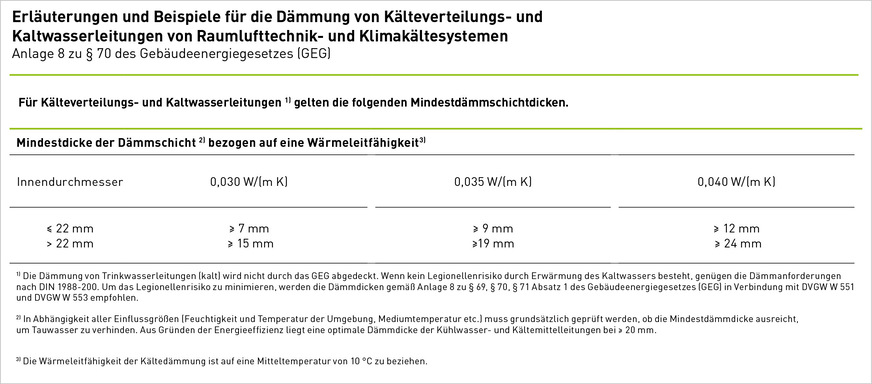 Den Empfehlungen der Fachverbände und Unternehmen ist der Gesetzgeber nun gefolgt und schreibt den Einsatz bedeutend höherer Dämmniveaus vor. Kälteverteilungs- und Kaltwasserleitungen sind nach dem neuen GEG bei einem Innendurchmesser von bis zu 22 mm mit einer Mindestdämmschichtdicke von 9 mm zu dämmen und ab einem Innendurchmesser von mehr als 22 mm beträgt die Mindestdicke der Dämmschicht 19 mm. Diese Mindestanforderungen beziehen sich auf eine Wärmeleitfähigkeit des Dämmstoffs von 0,035 W/(m K) bei einer Mitteltemperatur von 10 °C.