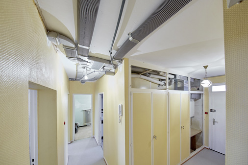 Um auch beim Thema Luftverteilung möglichst wenig Wohnraum einbüßen zu müssen, entschied sich der Wohnungseigentümer für eine dezente Verlegung über einer abgehängten Decke im Flur der Wohnung. „Dank der hohen Räume im Altbau lag diese Variante quasi auf der Hand“. Die Luftverteilung erfolgt über die Flachovalrohre ComfoTube flat51, wodurch jenseits der Abhängung nur ein geringer Aufbau notwendig war und der Altbaucharakter ohne sichtbare Einbußen erhalten werden konnte.