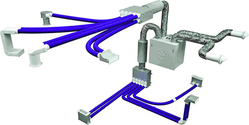 Aufgrund der Sterntopologie werden alle Zu- beziehungsweise Abluftventile unabhängig voneinander von einem zentralen Punkt aus versorgt. Das System kann dabei flexibel an den Luftbedarf in den einzelnen Räumen angepasst werden; die maximale Luftmenge pro Rohr beträgt 30 m 3 /h. Ist gemäß DIN-Norm in einem Raum ein höherer Volumenstrom notwendig, werden die Rohrleitungen entsprechend ausgelegt: So müssen beispielsweise bei einem Volumenstrom von bis zu 60 m3/h lediglich zwei Rohre und ein Ventil verbaut werden, um die Vorgaben zu erfüllen.