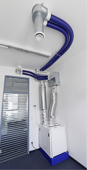 Das modulare Luftverteilungssystem BlauFast eröffnet für zentrale Lösungen jedoch neue Installationsmöglichkeiten: Dessen wesentliche Komponente sind kompakte, halbstarre Lüftungsrohre mit einem Durchmesser von 75 mm, die mittels Koextrusion aus hochwertigem, robustem Kunststoff gefertigt werden und deshalb sehr stabil und flexibel sind. So lassen sich die Rohre einerseits leicht verbiegen – der Biegeradius liegt bei 150 mm – und können ohne Spezialwerkzeug installiert werden. Andererseits sind sie deformationsbeständig und erreichen eine Belastungsfähigkeit von 8 kN/m², was beispielsweise bei Betondecken von Vorteil ist.