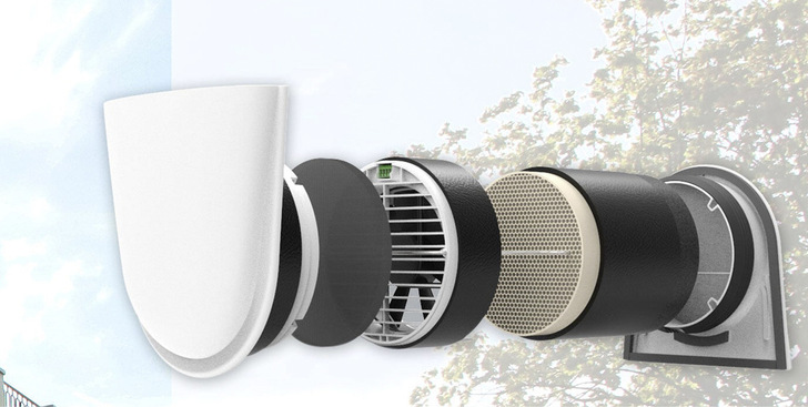 Die Zewo Slim Innenblende bildet das Endstück der Geräte und kann mit einem Staubfilter ausgestattet werden. Dank einer aerodynamischen Formgebung lenkt die Innenblende einströmende Luft über eine integrierte Leitschaufel effektiv in Innenräume. Für die Zewo Air-Lüftungsgeräte muss in Kombination mit der Innenblende keine Einstecktiefe berücksichtigt werden. Sie können bereits ab einer Wandstärke von 230 mm installiert werden. Für einen maximalen Luftvolumenstrom wird die Luft in der Blende über eine viertelkreisförmige Strömungslenkung geführt. Zudem sind ihr Austrittsquerschnitt vergrößert und die Abschlusskante abgerundet worden. Die weiße Blende (RAL 7016) aus Kunststoff fügt sich mit einer Tiefe von 45 mm dezent in Wohnräume ein.