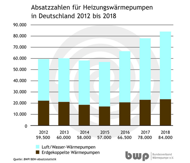 Anhand der gemeinsam mit dem Bundesverband der Deutschen Heizungsindustrie erhobenen Zahlen ist ersichtlich, dass auch der Absatz von Warmwasserwärmepumpen verglichen mit dem Vorjahr um 11 Prozent angestiegen ist: es wurden 15.000 Geräte verkauft. Im Jahr 2018 wurden somit insgesamt 99.000 Wärmepumpen auf dem deutschen Markt abgesetzt. Für das laufende Jahr rechnet der Verband mit einer Fortsetzung des Wachstumstrends.