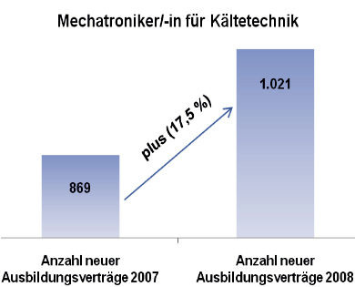Der Beruf des „Mechatroniker/in für Kältetechnik“ erfreut sich bei der Berufswahl der Schulabgänger steigender Beliebtheit: Mit 1021 neu abgeschlossenen Ausbildungsverträgen (ein Plus von 152/17,5%) knüpft das Ausbildungsjahr 2008 an die Steigerung vom letzten Jahr (plus 209 Verträge/32%) an.