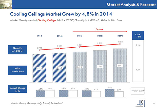 06.03.2015 – Der Markt für Kühldeckensysteme inDeutschland, Österreich, Frankreich, Italien, Polen und der Schweiz ist 2014 im Wert um 4,6 Prozent gestiegen. Dies entspricht einem Marktvolumen von 231,6 Mio. Euro bzw. 3,07 Mio. m2 aktiv verlegter Kühlfläche. Für das Jahr 2015 rechnet Interconnection Consulting mit einem Marktwachstum von 4,7 Prozent in der Menge. Markttreiber seien die geringen Betriebskosten. Im Jahr 2014 betrug das Marktwachstum in den genannten Ländern 4,8 Prozent in der Menge und 4,6 Prozent im Wert. Wurden im Jahre 2013 noch 2,93 Mio. m2 verlegt, so waren es im Jahr 2014 bereits 3,07 Mio. m2. Dies entspricht einem Marktvolumen von 231,6 Mio. Euro. Auf Deutschland, den größten Markt, entfielen 78 Mio. Euro. Frankreich ist mit 27,6 Prozent der zweitgrößte Markt, wohingegen Italien mit 11,0 Prozent Marktanteil im Wert im Mittelfeld rangiert. Entgegen der rückläufigen Baukonjunktur in Italien erfreute sich der Markt für Kühldeckensysteme einer positiven Entwicklung von 1,3 Prozent Wachstum in der Menge. Über den Prognosezeitraum 2013 bis 2017 erwartet Interconnection ein jährliches Durchschnittswachstum von 3,2 Prozent in der Menge und 4,8 Prozent im Wert. www.interconnectionconsulting.com