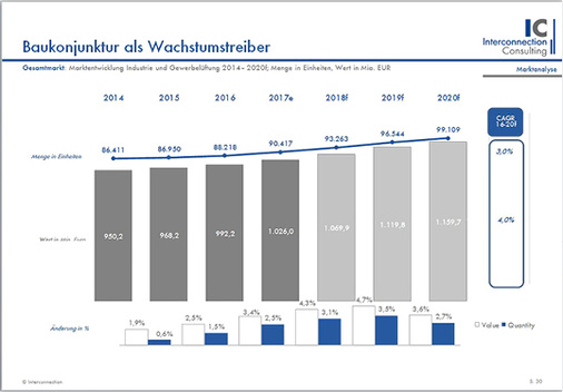 Der Gesamtmarkt (Bild) für Industrie- und Gewerbelüftung in Deutschland, Frankreich, Großbritannien, Italien und Polen verzeichnete 2017 ein Absatzplus von 2,5 Prozent. Bis 2020 soll das Wachstum laut einer Studie von Interconnection Consulting jährlich 4,0 Prozent im Durchschnitt betragen. Das Wachstum 2017 war am stärksten in Polen mit 5,5 Prozent, gefolgt von Italien mit 3,8 Prozent, Deutschland mit 2,5 Prozent und Frankreich mit 2,1 Prozent; Großbritannien verzeichnete einen Rückgang. Insgesamt betrug das Marktvolumen in den fünf Märkten 1,03 Mrd. Euro und soll bis 2020 auf 1,16 Mrd. Euro ansteigen. Der größte Absatzmarkt ist Deutschland mit einem Anteil von 36,2 Prozent, gefolgt von Polen mit 25,3 Prozent.