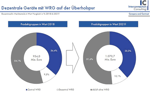 Der Markt für Wohnraumlüftung in Europa stieg im letzten Jahr im Umsatz um 3,9 Prozent. Aufgrund der weiteren Fortentwicklung des Bausektors wird das Wachstumstempo auch in den nächsten Jahren bestehen bleiben, wie Interconnection Consulting in einer neuen Studie zeigt. Die derzeitigen Indikatoren sprechen dafür, dass der Markt für Wohnraumlüftung in den untersuchten Märkten (Deutschland, Österreich, Schweiz, Frankreich, UK, Italien, Polen, Benelux) bis 2021 um 2,7 Prozent jährlich zulegen wird. Der größte Markt ist Frankreich mit einem Anteil an den untersuchten Ländern von 32,3 Prozent vor Deutschland mit 22,9 Prozent und Benelux mit 21,6 Prozent. Dezentrale Anlagen konnten 2017 europaweit einen Anstieg von 14,2 Prozent in Menge verzeichnen, vor allem im Neubau und dort wiederum bei größeren Wohnanlagen. Bereits jetzt haben dezentrale Systeme im D-A-CH-Raum einen Anteil von 31 Prozent und werden diesen auf 34,5 Prozent bis 2021 ausbauen (Bild).