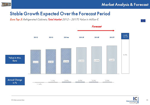 12.06.2014 – Der Markt für Kühlmöbel im Lebensmittelhandel fasste 2013 in den fünf untersuchten Märkten Deutschland, Frankreich, Italien, Großbritannien und Benelux wieder Tritt. Der Markt wuchs um 1,9 Prozent in Wert und erreichte ein Marktvolumen von 2,15 Mrd. Euro. Auch für die kommenden Jahre erwartet Interconnection Wachstum, sodass der Markt im Jahr 2017 rund 2,47 Mrd. Euro schwer sein wird. 2013 belief sich das aggregierte Marktvolumen der fünf untersuchten Märkte Frankreich, Deutschland, Italien, Großbritannien und Benelux-Staaten auf 2,15 Mrd. Euro. Gegenüber dem Jahr 2012 entspricht dies einem Wachstum von 1,9 Prozent. Deutschland vereint mit 29,2 Prozent den größten Marktanteil auf sich.