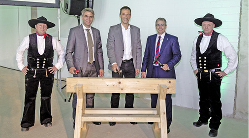 Die Vaillant Group hat das Richtfest ihres Remscheider Forschungs- und Entwicklungszentrums gefeiert. Im Beisein zahlreicher Vertreter der Stadt Remscheid, der am Bau beteiligten Unternehmen und weiterer Gäste schlugen die drei Geschäftsführer der Vaillant Group Dr. Andree Groos (2. v. l.), Dr.-Ing. Norbert Schiedeck (Mitte) und Dr. Stefan Borchers (2. v. r.) symbolisch den letzten Nagel in einen Dachbalken. Das 54 Mio. Euro teure Forschungs- und Entwicklungszentrum wird im fertigen Zustand aus drei Gebäudeteilen bestehen: zwei Verwaltungsgebäude und ein Testcenter. Es wird über 230 Prüfständen Platz bieten – davon allein 40 Prüfstände für Wärmepumpen.