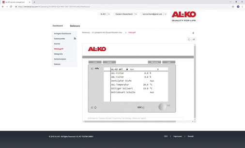 Besonders komfortabel ist das Fernzugriffsportal von AL-KO Lufttechnik, ein webbasiertes Remote-Servicing-System. Damit lassen sich installierte RLT-Anlagen jederzeit und ortsunabhängig verwalten und überwachen. Mit nur wenigen Klicks erhält das Fachpersonal sowie auf Wunsch auch der Anlagenbetreiber eine vollständige Übersicht über die zu betreuenden Anlagen. Alle relevanten Prozessdaten werden kontinuierlich erfasst und automatisch an einem zentralen oder lokalen Ort gespeichert. Der Zugriff auf diese Echtzeit-Daten der vernetzten Anlagen ermöglicht eine stetige Wartung, erhöht durch die Möglichkeit schneller und gezielter Eingriffe die Langlebigkeit einzelner Komponenten und spart Kosten ein.
