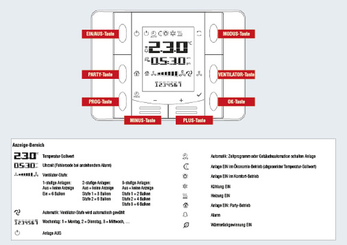 Ob Endnutzer-, Inbetriebnahme- oder Hersteller-Parameter, alle lassen sich mithilfe dieser beiden HMIs einstellen. Ermöglicht wird der Zugriff auf alle Alarme und deren Quittierung, auf die Sollwerte, das Zeitschaltprogramm, den Ferienkalender, alle Datenpunkte wie etwa Temperatur, Feuchte, Volumenstrom oder Druck, jeweils in Echtzeit. Die LEDs des HMIs zeigen durch Farbänderung und durch Dauerleuchten oder Blinken verschiedene Anlagenzustände an. Für die Montage des Technikraumbediengerätes sind zwei Magnete an der Rückseite vorhanden. So haftet es an allen ferromagnetischen Flächen. Eine Montage mittels Schrauben ist ebenfalls möglich.