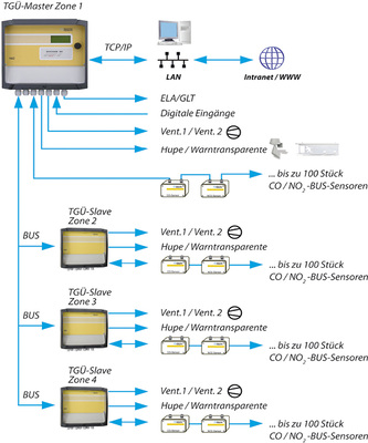 Die insgesamt am Flughafen eingesetzten 24 Master- und 42 Zonengeräte sind jeweils ausgelegt für den Anschluss von bis zu 100 Sensoren (CO oder NO2). Die Kommunikation der Master / Slaves untereinander erfolgt über ein Bussystem. Jedes Zonengerät (Slave) meldet alle Daten an den übergeordneten Master, bei dem die Daten aller im System angeschlossenen Sensoren zusammengeführt werden. Von dort aus erfolgt die Systemintegration an die übergeordnete Leit- und Alarmebene.