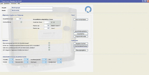 Für die Planung der notwendigen Zonen, CO-Sensoren, sowie Alarmsignalisierung stellte Oppermann dem Planer eine kostenfreie Software zur Verfügung. Mit wenigen Eingaben lassen sich so die benötig-ten Komponenten jeder Garage ermitteln. Auf Knopfdruck werden die Anlagenkonfiguration sowie die Ausschreibungstexte und die Datenblätter generiert. Von der kleinen Garage mit meist nur zwei bis drei CO-Sensoren bis zur Großgarage lassen sich so einfache und komplexe Planungsaufgaben komfortabel, zeit- und kosten-sparend lösen.