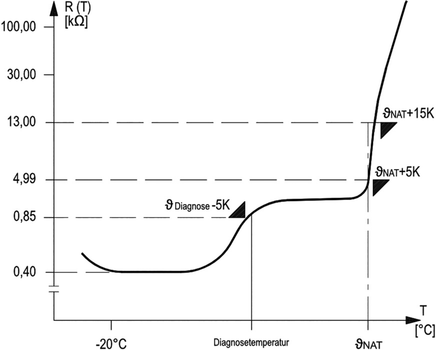 Der PTC und das Bimetall können normalerweise nicht zur Steuerung verwendet werden, da sie mehr oder weniger nur zwei verschiedene Ausgangswerte haben: niedriger und hoher Widerstand. Wenn aus Sicherheitsgründen ein PTC auch zur Steuerung eingesetzt werden soll, kann der Sensor AMS von Kriwan eine Alternative darstellen. Er basiert auf PTC-Sensoren, indem zwei unterschiedliche PTCs mit entsprechenden NAT (Nennanspruchtemperaturen) kombiniert werden. Dadurch wird neben der sicherheitsrelevanten PTC-Funktion auch ein sich kontinuierlich änderndes Ausgangssignal möglich, das von einem Mikroprozessor einfach linearisiert werden kann.
