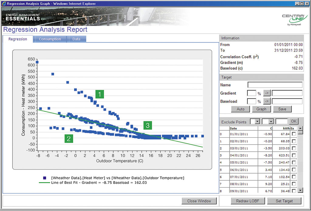 Besonders interessant sind Regressionsanalysen. Hierbei werden zwei verschiedene Größen als Punktmenge aufgetragen. In Bild 5 stellt jeder Punkt den Tagesenergieverbrauch für Heizenergie (y-Achse), aufgetragen über die mittlere Außentemperatur (x-Achse), dar. Durch Auswertung der Punkthäufungen erhält man wichtige Erkenntnisse: Die Lage des Knicks zeigt die Heizgrenze. Beim Gebäude unten liegt diese bei circa 15 °C. Ist die Außentemperatur höher, wird lediglich wenig Heizenergie für die Brauchwasserbereitung verbraucht.