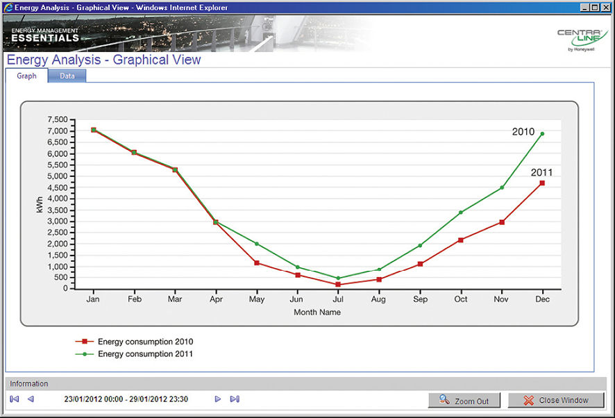 Auf Managementebene können längere Zeitintervalle betrachtet werden, weil dort mehr Speicherplatz zur Verfügung steht. Somit ist ein Benchmark über mehrere Jahre möglich (Jahresvergleich). Bild 3 zeigt, dass im zweiten Quartal des Jahres 2011 (rote Kurve) eine Optimierung durchgeführt wurde (Isolierung), die im Anschluss zu weniger Verbrauch in den kalten Monaten führte.