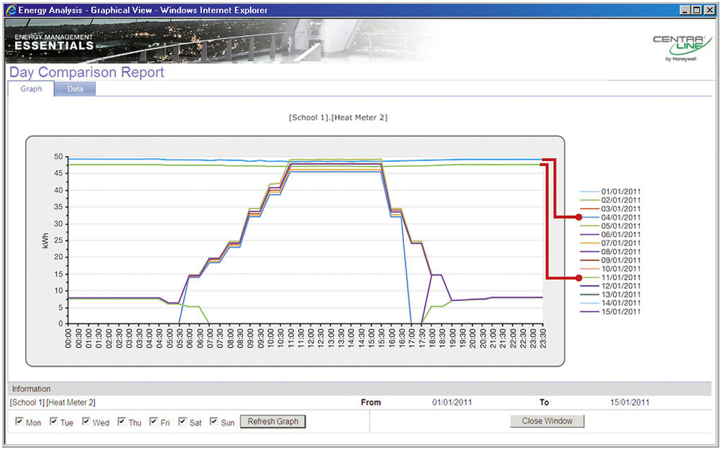 Um regelmäßigen Ausreißern auf die Spur zu kommen, sind Wochentag-Benchmarks hilfreich. Hier wird für jeden Tag der Energieverbrauch über einen bestimmten Zeitraum hinweg aufgetragen. Signifikante Abweichungen einzelner Tage sind dadurch auf einen Blick sichtbar. Bei einem Bürogebäude oder einer Schule würde man während aller Werktage einen ähnlichen Verlauf des Energieverbrauchs erwarten, samstags und sonntags dagegen niedrigere Verbrauchswerte. Bild 6 zeigt jedoch einen unerwarteten Verlauf am Dienstag, an dem offensichtlich über den kompletten Tagesverlauf geheizt wurde.