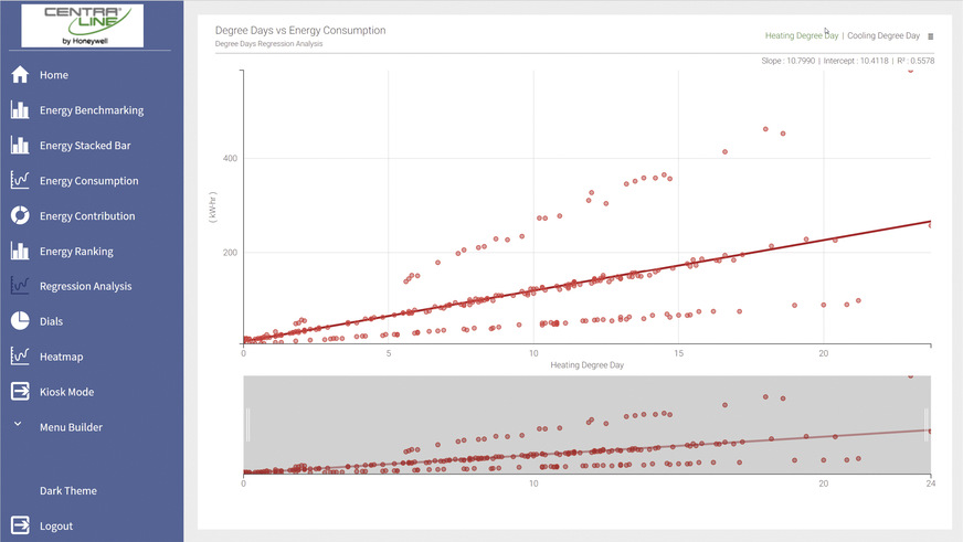 Zur Ermittlung ineffizienter Energienutzung sind Software-Tools mit Dashboard-Darstellung wie der Energy Manager, der auf Niagara eXtended basiert, hilfreich. Das Tool ist Teil der Monitoring- und Managementlösung Arena NX, verwaltet die gesammelten Energiedaten und wertet sie mithilfe einer Regressionsanalyse aus, um den Energieverbrauch zum Beispiel mit der Außentemperatur, den Gradtagen oder einem beliebigen anderen Wert zu vergleichen und auf Basis dessen zu regulieren.