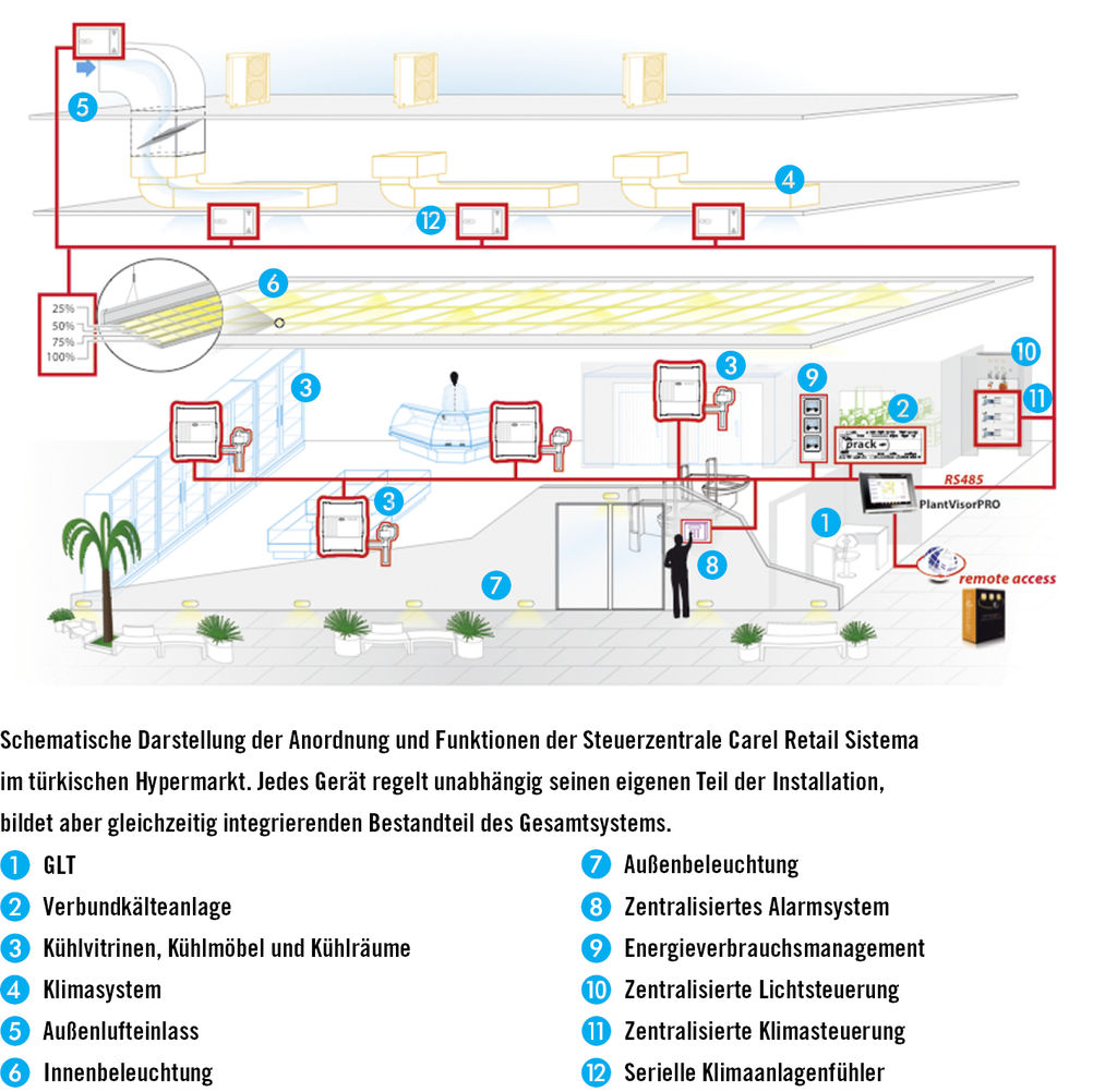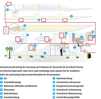 Carel Retail Sistema übernimmt die komplette Ansteuerung der Lebensmittelkältetechnik von den Verbundanlagen bis hin zu den Kühlmöbeln und Kühlräumen. Gleichzeitig werden im komplexen Supermarkt mithilfe der flexiblen Systemkomponenten pCO sistema und PlantVisorPRO auch die Klima-, Beleuchtungs- und Energiesysteme geregelt. Dadurch war kein weiteres GLT-System mehr erforderlich.