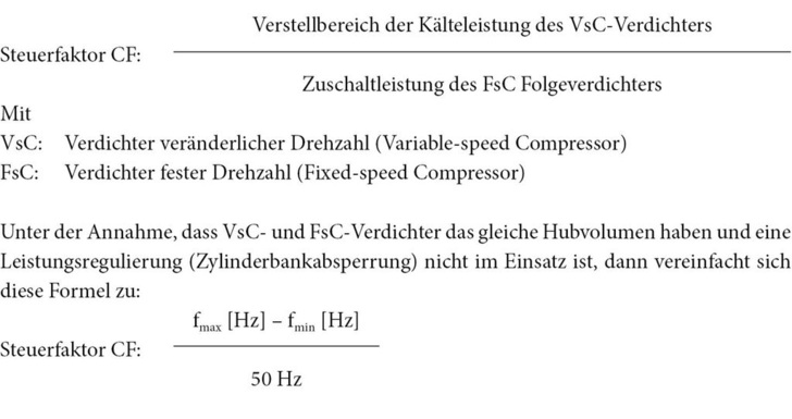 Bild 1 zeigt den Vergleich zwischen Verdichterverbundauslegungen mit Steuerfaktoren von 60 und 80 Prozent. Bei einem zu geringen Steuerfaktor ist leicht zu erkennen, dass der Verstellbereich des VsC-Verdichters zum Ausregeln des Zu- und Abschaltens des FsC-Folgeverdichters nicht ausreicht. Daraus würde ein unruhig laufendes Kältesystem mit häufigem Verdichterschalten resultieren. Daher wird von Auslegungen abgeraten, bei denen der Steuerfaktor CF in der Nähe von 60 Prozent liegt.