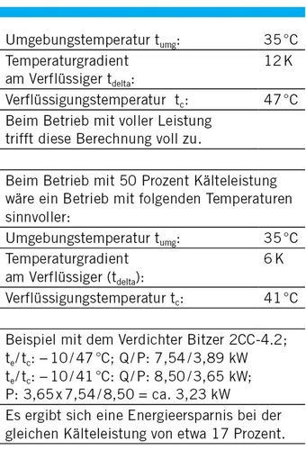 Die Anpassung der Verflüssigerleistung an die vorgegebenen Einsatzbedingungen, vor allem an die Temperatur der Umgebungsluft und die benötigte Verflüssigungsleistung, ist eine weitere mögliche Maßnahme. Das Prinzip einer Außentemperatur-gesteuerten Regelung ist allgemein bekannt. Darüber hinaus wird hier vorgeschlagen, den Temperaturgradienten zusätzlich zum Kältebedarf anzupassen. Hierzu zwei Beispiele: