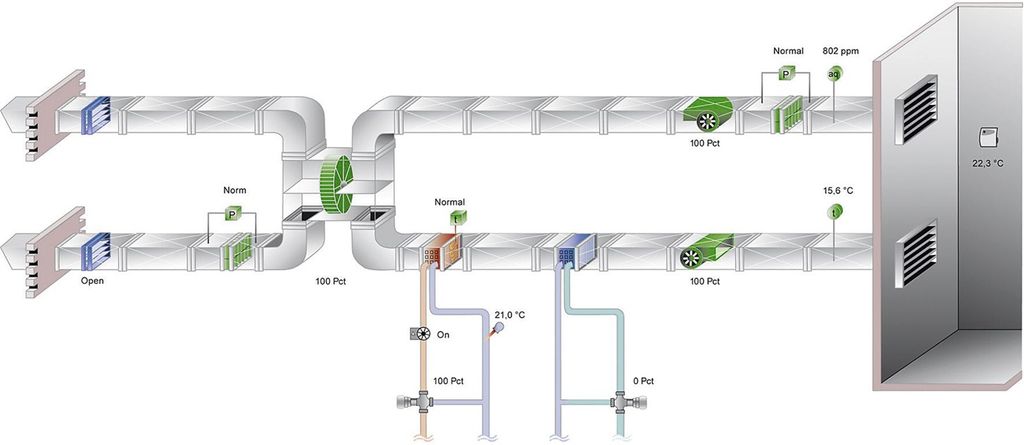 Das bedeutet, dass im sogenannten Komfortbereich, also wenn die Raumtemperatur nicht wesentlich vom Raumsollwert abweicht, nur ein geringer Frischluftanteil zugeführt wird, um Energie einzusparen. Ist die Raumtemperatur wesentlich niedriger als der Sollwert, wird geheizt und der Volumenstrom erhöht, um schneller in den Komfortbereich zurückzukommen. Wenn die Raumtemperatur wesentlich höher als der Sollwert ist, wird gekühlt und gleichzeitig der Volumenstrom erhöht.