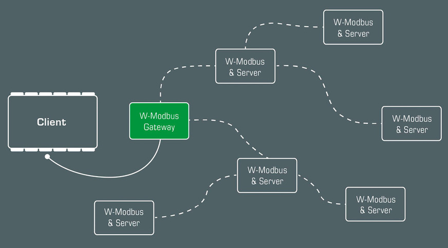 Ein W-Modbus-Netzwerk besteht aus einem W-Modbus-Gateway, das über ein RS 485-Kabel mit dem Modbus-Client und drahtlos mit bis zu 100 W-Modbus-Geräten verbunden ist. Mithilfe der drahtlosen Verbindung können einzelne Elemente innerhalb weniger Minuten einfach ausgetauscht, hinzugefügt oder entfernt werden. Dies macht Wireless Modbus zu einem kosten- und zeitsparenden Kommunikationsprotokoll.