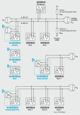 Auch Mischformen von verdrahteten und funkbasierten Modbus-Geräten können über das W-Modbus-Gateway in bestehende Netztopologien eingebunden werden.
