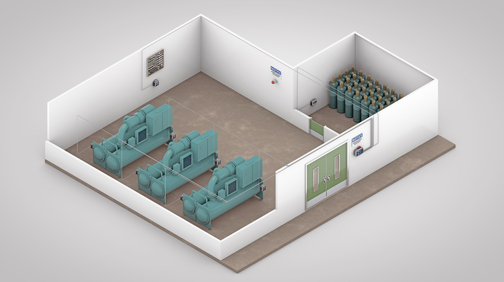 Im Falle eines Kältemaschinenraums muss die Alarmanlage sowohl innerhalb als auch außerhalb des Maschinenraums warnen. Der Alarm außerhalb des Kältemaschinenraums kann in einer Überwachungszentrale installiert werden.