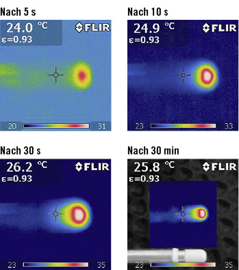 Variiert wurden bei den unterschiedlichen Varianten die Wandstärke sowie der Abstand zwischen Heizer und Temperatursensor. Eine Verringerung der Wandstärke sowie Vergrößerung des Abstands ermöglichen eine bessere thermische Entkopplung zwischen den Sensorelementen. Da es durch Eigenthermik bedingt in der Realität niemals eine Nullströmung gibt, wurden die Varianten exemplarisch auch anhand von 0,1 m/s Strömung simuliert. Die Variante 3 wurde anschließend als Grundlage für den Bau weiterer Prototypen verwendet, anhand derer die Simulationsergebnisse in der Praxis wiederholt wurden ( Bild 7 ).