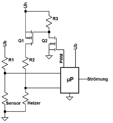 Die Messung der Mediumstemperatur wie auch die Regelung der Übertemperatur werden von einem Mikroprozessor übernommen. Hierdurch ist es nicht nötig, eine Wheatstonesche-Messbrücke einzusetzen. Besser ist die Temperaturmessung in einem separaten Zweig mit konstanter Spannung, da dort dann nur der Widerstandswert temperaturabhängig variiert.
