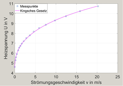 Die beiden Parameter werden nun be-nötigt, um aus der Heizspannung die Strömungsgeschwindigkeit zu bestimmen. Hierzu wird das Kingsche Gesetz nach