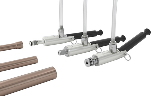 Daneben gibt es auch Prüfadapter zur Abdichtung am Rohr-Außendurchmesser: Mit dem Schnelladapter TW241 können Glattrohre aus Kupfer, Stahl oder Aluminium (ab Rohr-Außendurchmesser 6,0 mm) schnell und einfach auf Dichtigkeit geprüft werden. Darüber hinaus eignet sich der TW241 auch für Unterwasser-, Druckabfall- und Heliumtests bis maximal 70 bar. Auch große Rohraußendurchmesser bis 44,0 mm stellen kein Problem dar.