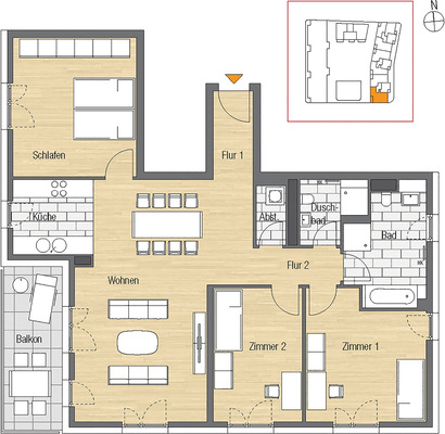 Die 118 m² große 4-Zimmer Wohnung mit Südausrichtung – dazu gehören außerdem ein Bad, ein Duschbad, ein Abstellraum sowie eine Küche - wird von vier Bewohnern (zwei Erwachsene und zwei Kinder) bewohnt. Sie befindet sich im 1. OG eines 7-stöckigen Mehrfamilienhauses.