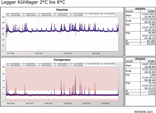 Ende 2014 wurde entschieden, die notwendigen Messungen für Temperatur und Luftfeuchtigkeit in den neuen Hochregallager- und Produktionsräumen vorzunehmen. Marko Schulze, GxP-Berater bei Rotronic, zeigte den Verantwortlichen das Vorgehen bei einem Mapping auf. Adrian Meier, Chief Operating Officer (COO) von Proderma, erklärt die Raumaufteilung des Verpackungsspezialisten folgendermaßen: Wir verfügen über vier verschiedene Sektoren: Ein 3 bis 8 °C-Lager, wo vor allem verderbliche Lebensmittel wie Joghurtkulturen, Salatsaucen, Reibkäse etc. eingelagert werden. 15 °C bis 25 °C warme Räumlichkeiten, die ideal für die Aufbewahrung von Arzneimittel oder Schokolade sind. Und dann verfügen wir auch über Wärmeschränke, in denen beispielsweise Shampoo oder Honig bei rund 40 °C schonend erwärmt werden können, um sie anschließend durch die niedrigere Viskosität qualitativ besser zu verpacken. Last, but not least können wir unseren Kunden auch einen kostengünstigen unkontrollierten Sektor, der über Lagermöglichkeiten bei normaler Umgebungstemperatur verfügt, anbieten.“
