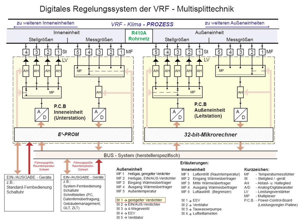 Die in der Außeneinheit und den Inneneinheiten installierten Messfühler (MF) werden mittels Multiplexer (MP) sowie Abtast- und Haltegliedern (AH) entsprechend einer Steuerlogik abgetastet. Anschließend werden die im Analog-/Digitalwandler (A/D) erzeugten digitalen Signale an 32-bit-Mikrorechner und E 2 -PROM übergeben. Hier erfolgt die Verarbeitung in unterschiedlichen Funktionsebenen anhand von bekannten (z. B. PID), aber auch neuartigen (z. B. Fuzzy-Logic usw.) Regelalgorithmen. Eine zentrale Aufgabe des Mikrorechners ist beispielsweise die Berechnung der aktuell erforderlichen/abrufbaren Verdichterleistung. Ermittelt werden dabei die: