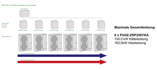 Mit dem Anschlusskit PAC-IF013 von Mitsubishi Electric für Zentral-lüftungsanlagen lässt sich auch eine Kaskadenregelung für bis zu sechs Außengeräte umsetzen. Dadurch vergrößert sich die Gesamtleistung auf bis zu 168 kW Kälte- und 189 kW Heizleistung. Für Einzelgeräte unterstützt die Schnittstelle die komfortable Zulufttemperatur-Regelung. Die Kaskadenregelung erfolgt dabei über ein flexibles Leistungseingangssignal – die 0–10 V-, bzw. 4–20 mA-Schnittstelle oder den ModBus. Die Leistungsabgabe kann so feiner auf die Anforderungen der Zentrallüftungsanlage abgestimmt werden. In zehn Stufen plus Aus“ erfolgt die Leistungsanpassung und sorgt dabei im Falle einer Kaskade für eine Abstufung im Bereich 20 bis 100 Prozent und bei Einzelgeräten von 30 bis 100 Prozent. Durch die ModBus-Schnittstelle ist darüber hinaus auch ein Zugriff von extern direkt auf das Anschlusskit und seine Daten möglich. Dabei können bei Bedarf auch Parameter verändert werden. Beim Einsatz einer Kaskade regelt das Anschlusskit auch einen automatischen Laufzeitausgleich der angeschlossenen Außengeräte. Gleichzeitig wird ein hoher SCOP- bzw. SEER-Wert durch eine intelligente Steuerung der Anlagen erreicht. Hierdurch arbeitet der Gesamtverbund der Anlagen im bestmöglichen Wirkungsgrad. Ein SD-Kartenslot im Anschlusskit ist zum einfachen Betriebs-Monitoring der Daten der Gesamtanlage nutzbar. Die Schutzfunktionen für die Außengeräte wurden weiter ausgebaut.