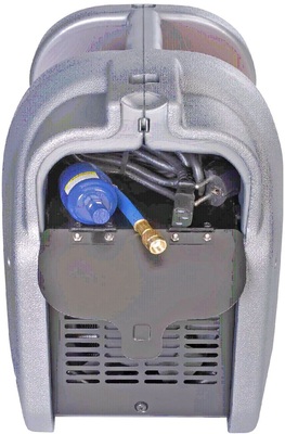 Mit Glycerin gefüllte Manometer ermöglichen ein präzises Ablesen. Praktisch ist das integrierte Staufach, in dem das komplette Zubehör (Ölfilter und Ölfilteranschluss, Stromkabel, Tragegurt) untergebracht ist. Das handelsübliche Stromkabel kann abgenommen werden, was Kabelschäden vorbeugt. Im Notfall ist es schnell ausgetauscht.