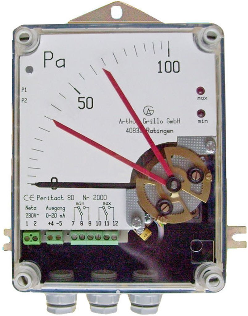 Bei Anlagen, wo nur eine Anzeige gewünscht wird, ist dieses Gerät relativ aufwendig, weshalb man nach neuen Lösungen suchte. Hierbei stellte man sich die Aufgabe, ein sehr kleines Gerät zu entwickeln, bei dem auch der Einsatz an Material minimal sein sollte. Das Ergebnis war ein Differenzdrucksensor. Dieses Gerät kann kleinste Drücke oder Differenzdrücke erfassen. Hier wird der zu messende Differenzdruck über zwei Anschlusstüllen auf die jeweilige Seite der geführten Membrane angeschlossen.