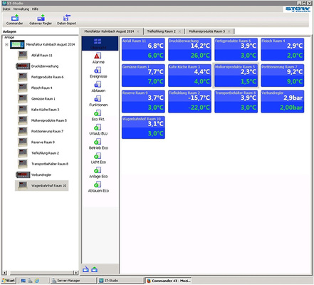 In ST-Studio ist eine sehr detaillierte Übersicht über die komplette Anlage möglich, angefangen mit einer aktuellen Temperaturübersicht sowie einer detaillierten Aufzeichnung und Dokumentierung der Temperaturkurven. Darüber hinaus werden Anlagenzustände wie Kühlung, Abtauung, Lüfter usw. dargestellt, wodurch das Betriebs- und Nutzungsverhalten bewertet werden kann.