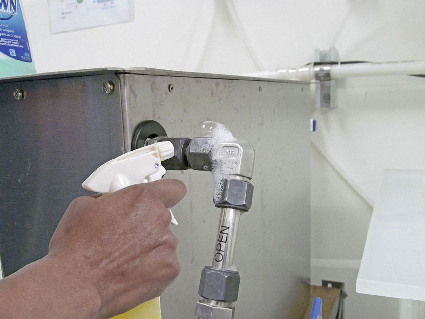 Um Leckagen zu lokalisieren, kommt häufig Lecksuchspray zum Einsatz. Dafür sprüht der Prüfer potenzielle Leckstellen mit einem Netzmittel ein. Im Falle eines Lecks tritt Luft aus, und es bilden sich sichtbare „Seifen-Bläschen“. Neben der einfachen Anwendung ist die Beliebtheit von Lecksuchspray wohl vor allem psychologisch zu begründen. Viele Menschen trauen vor allem den eigenen Augen. Die eigene Wahrnehmung scheint – oft unbewusst – vertrauenswürdiger als eine abstrakte technische Messanzeige.