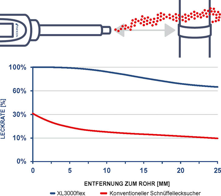 Das Schnüffellecksuchgerät XL 3000flex beispielsweise ist speziell auf die Anforderungen der Kälte- und Klimaindustrie abgestimmt und erreicht eine hohe Prozesssicherheit. Dafür gibt es insbesondere drei Gründe: